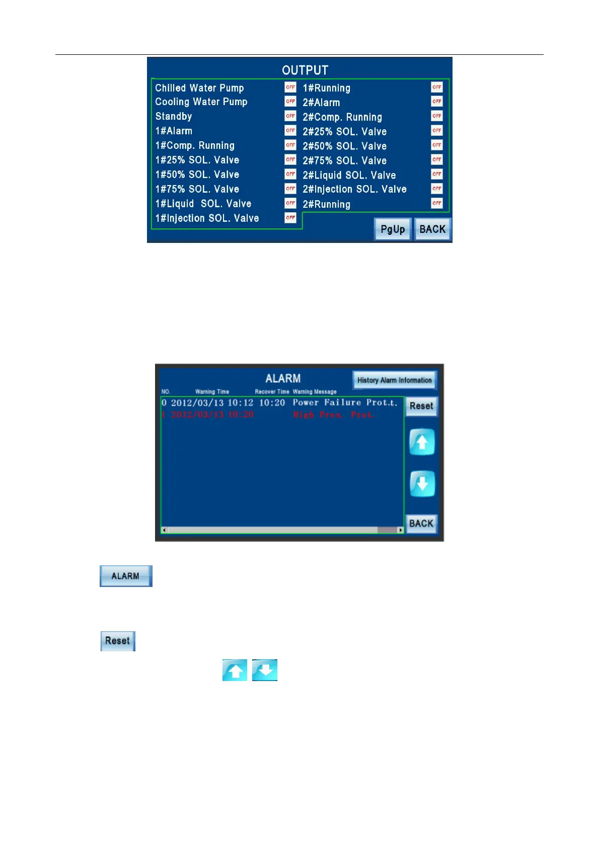 If there is any alarm, the unit will execute alarm procedure action. The unit alarm status can’t be