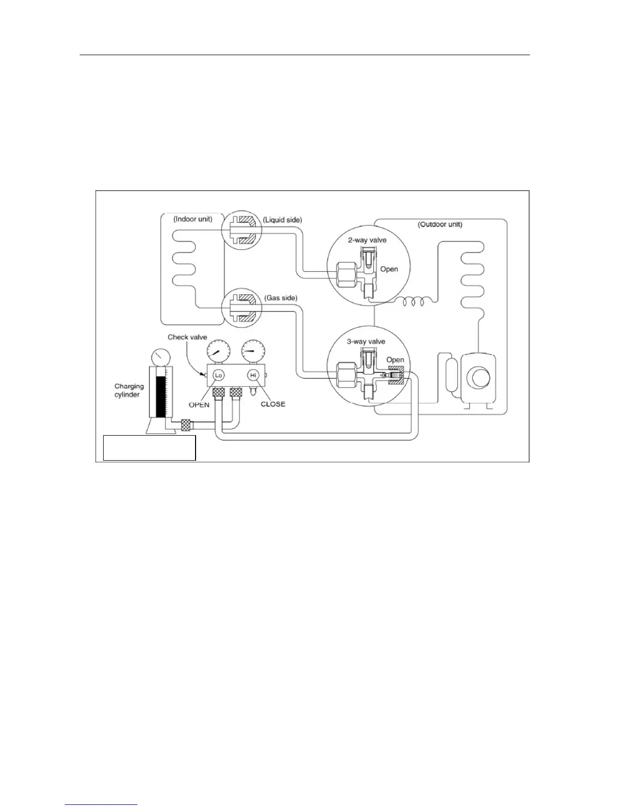 5) Open the valves (Low side) on the charge set and charge the system with liquid refrigerant.