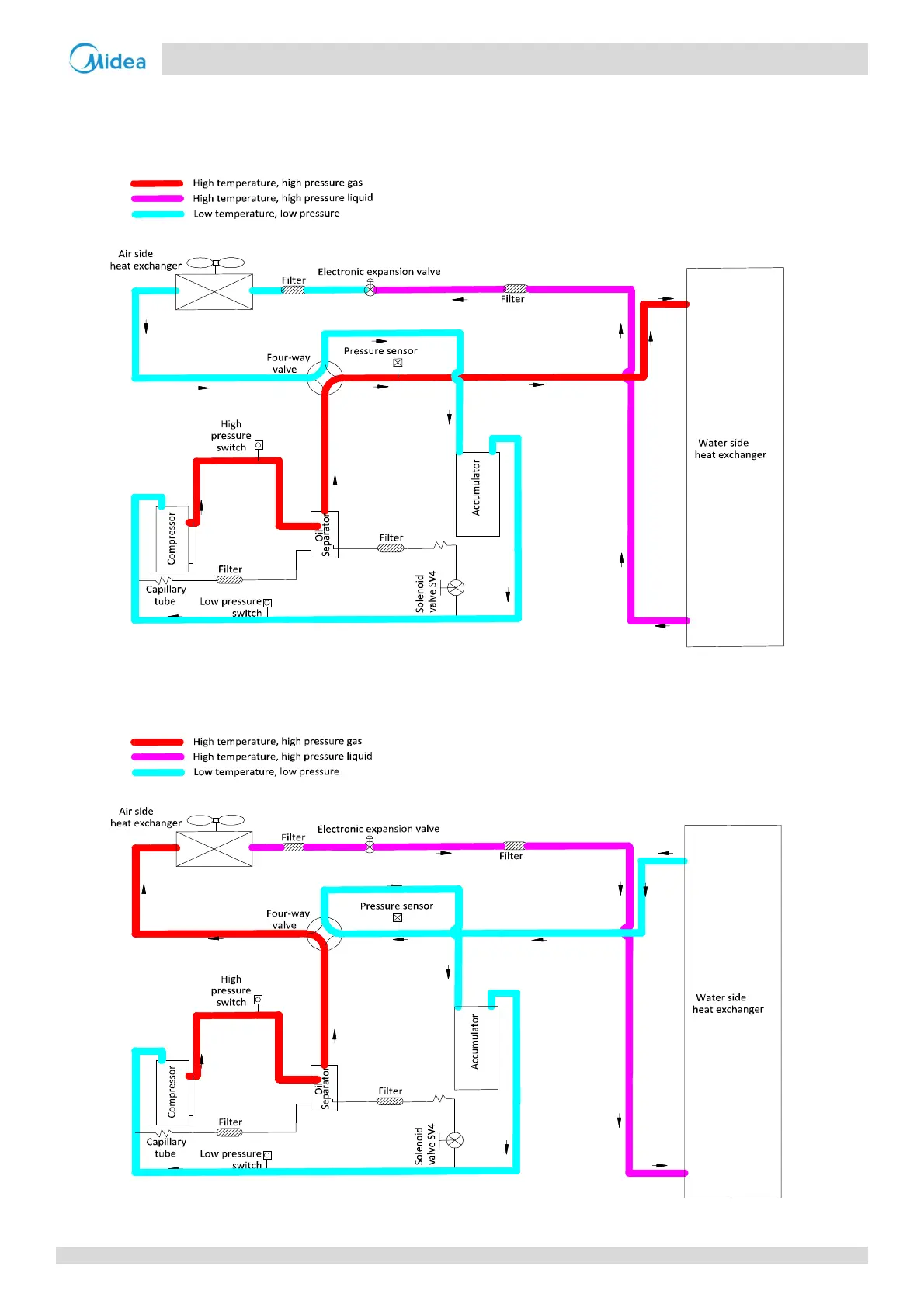 Figure 2-3.2: Refrigerant flow during cooling and defrosting operations