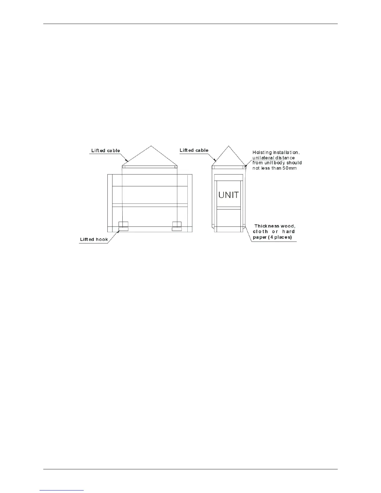 50mm thick wood block, cloth or hard paper. Any person is not allowed to stand below the unit when lifting it.