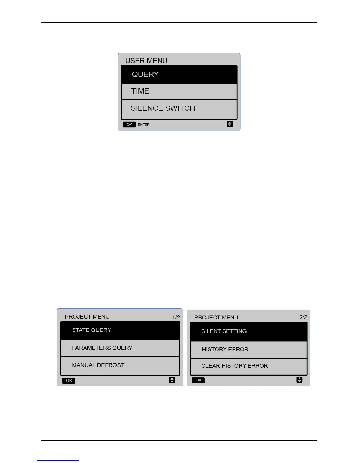 Select "PROJECT MENU", and press the "OK" button to enter the menu. The screen prompts the user to