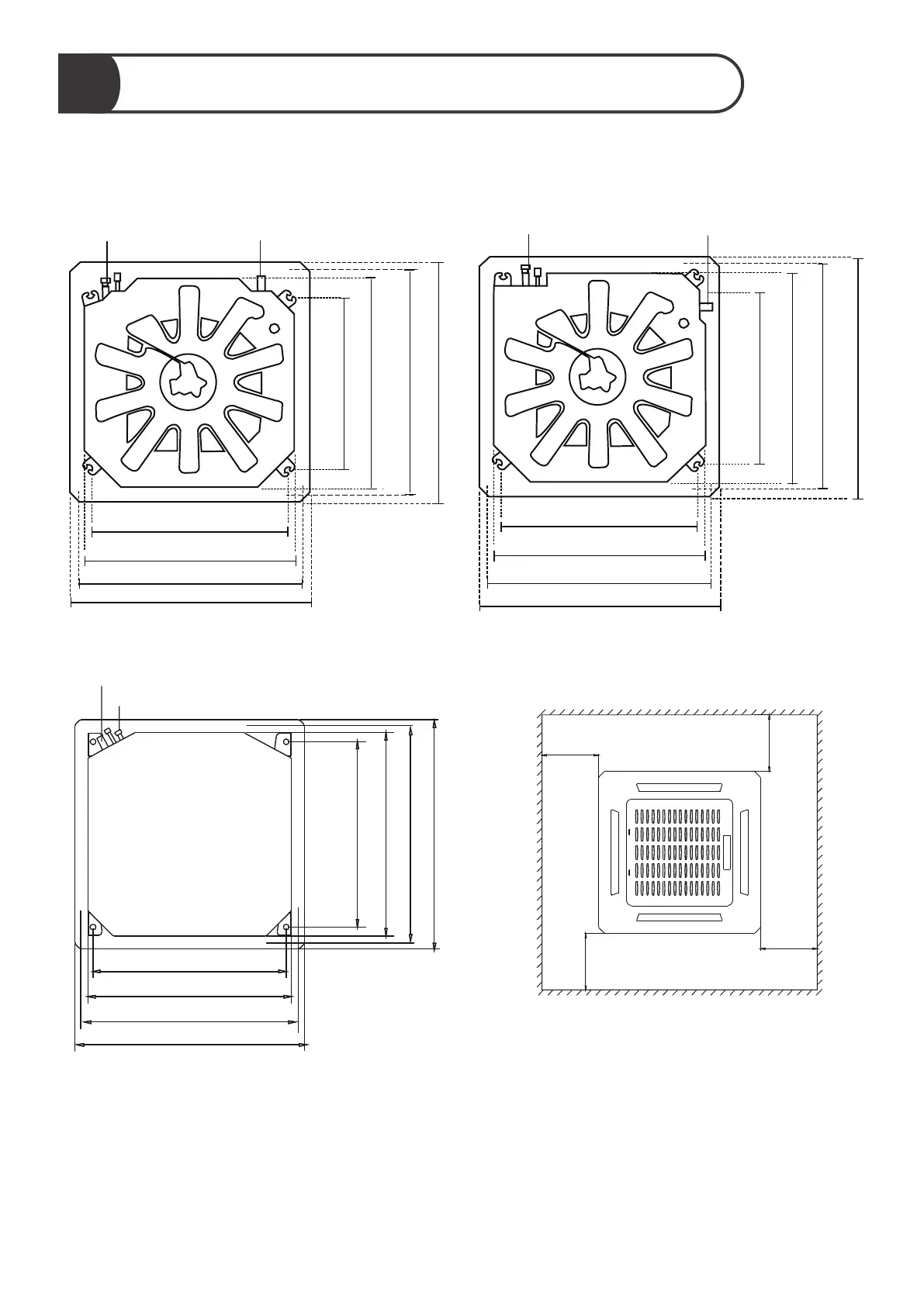 1. Use the included paper template to cut a rectangular hole in the ceiling, leaving at least 1m (39”)
