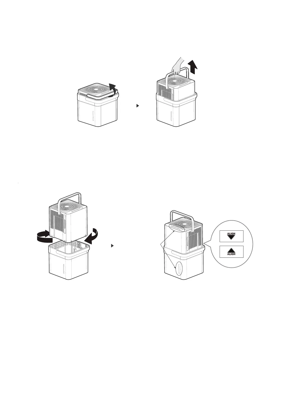 Rotate dehumidifier 90° and align the arrows on the two labels (one on the bucket and one on the