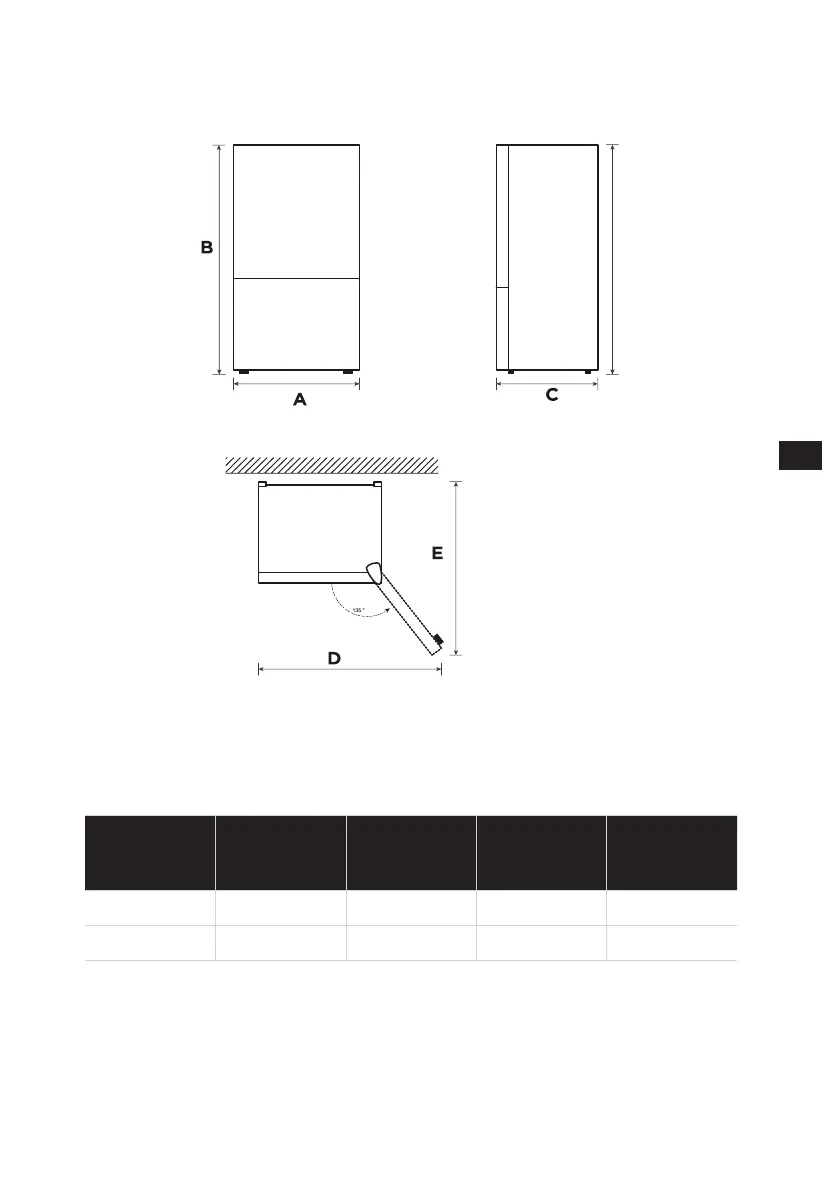 Diagrama do espaço necessário (com a porta aberta e com a porta fechada)