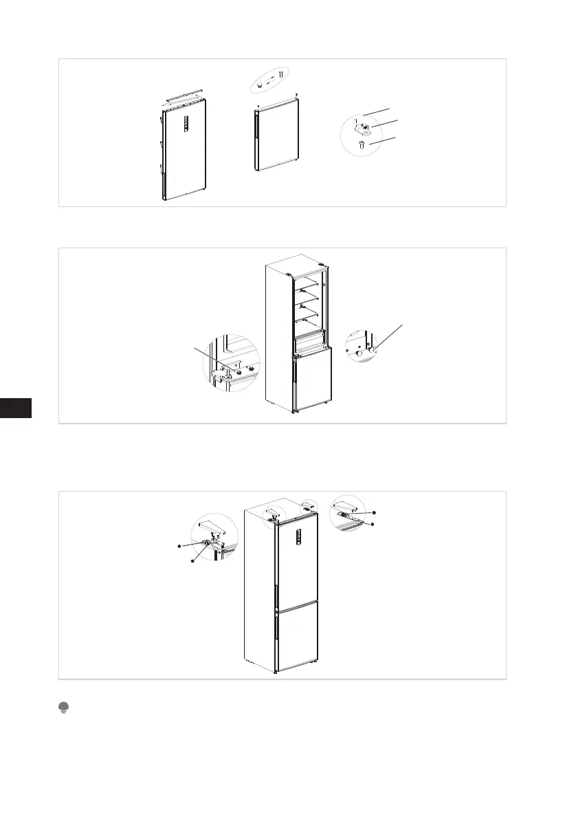 6. Postavite vrata zamrzivača na donju šarku, postavite srednju šarku, zavrtnje i poklopce