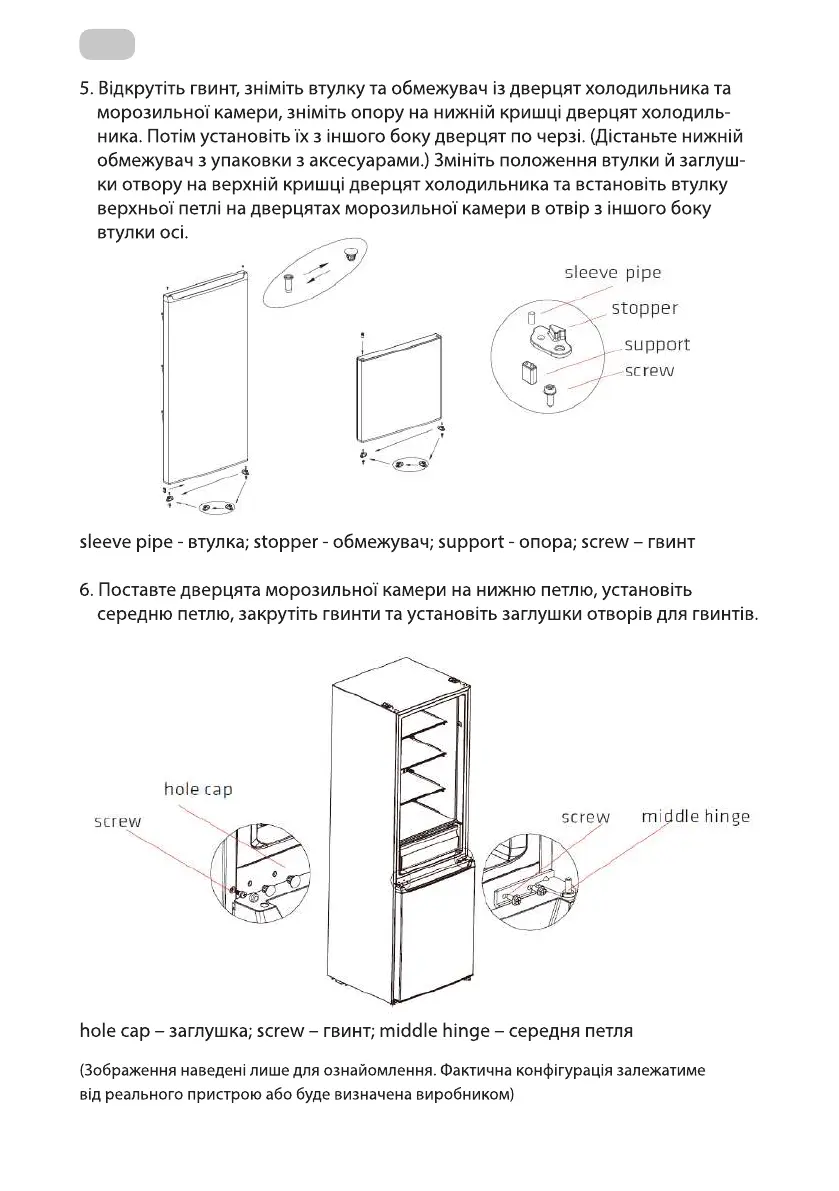 5. Відкрутіть гвинт, зніміть втулку та обмежувач із дверцят холодильника та морозильної камери,