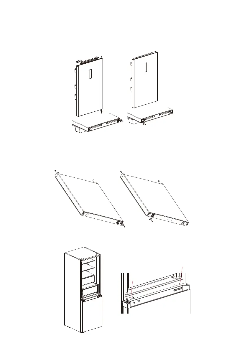 7.Joyi o'zgartirilgan muzlatgich eshigining pastki ilgakka o'rnating, so'ngra o'rta ilgakni o'rnating va ilgak