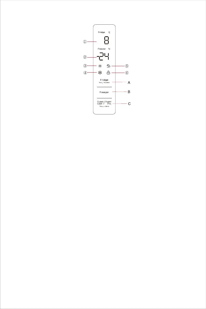 ①.Sovutish bo’limining harorati ②.Muzlatish bo’limining harorati ③.Tez sovutish tugmasi