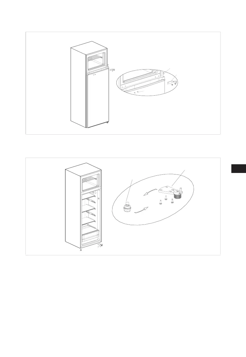 7. Uždėkite šaldytuvo duris ant apatinio vyrio, sumontuokite vidurinį vyrį, skylių