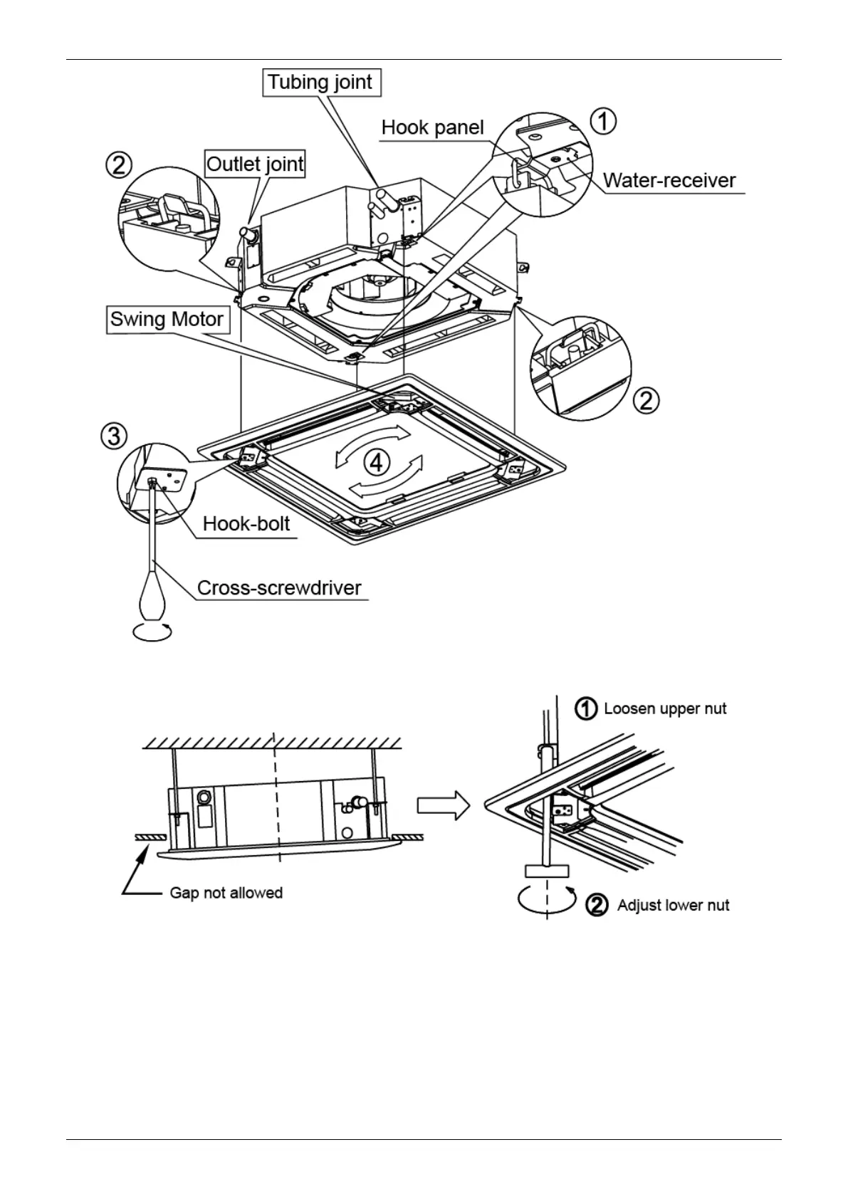 Tighten the screws under the panel hooks till the panel closely stick on the ceiling to avoid condensate