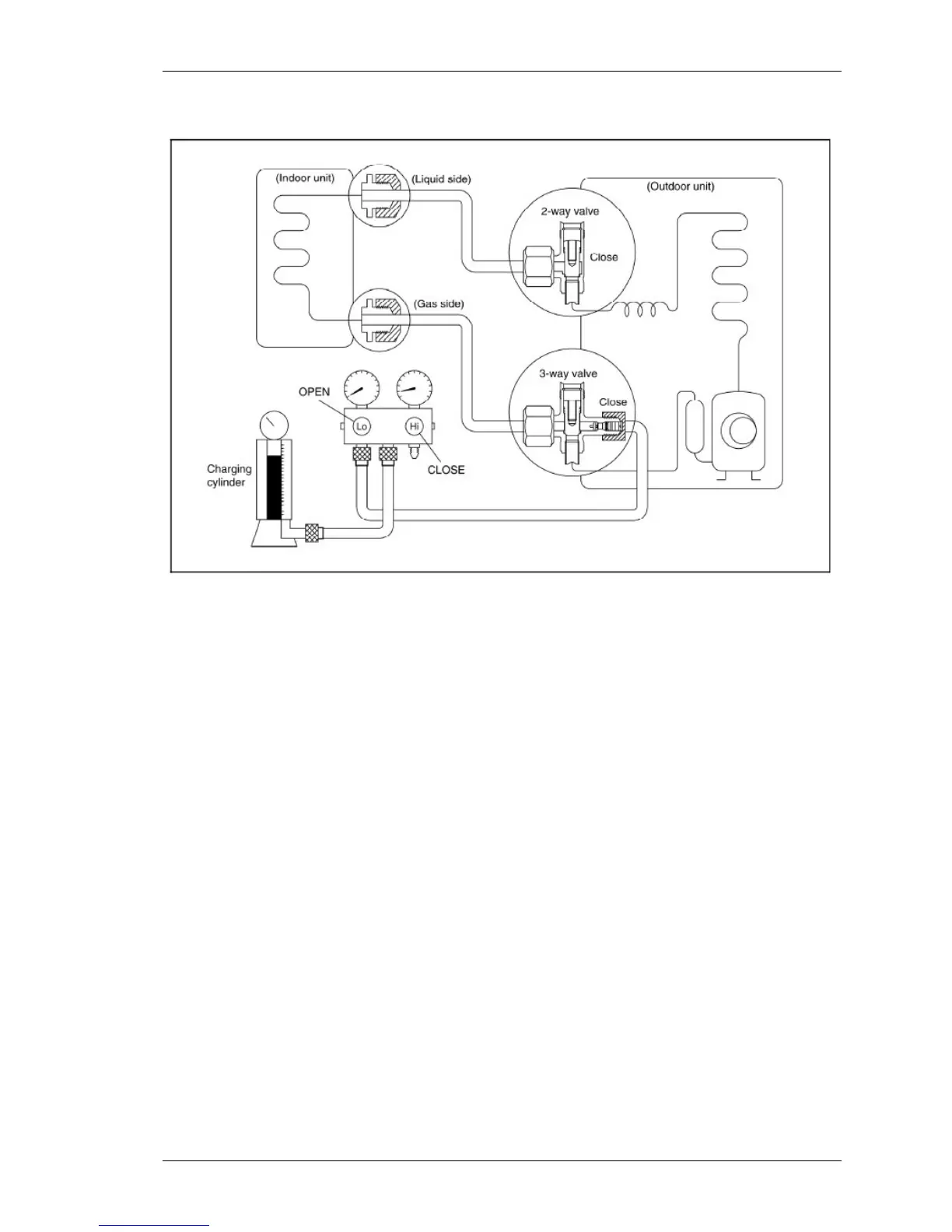 6). Disconnect the charge set and the charging cylinder, and set the 2-way and 3-way valves to