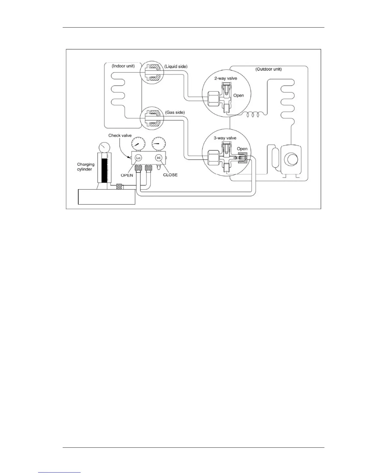 of the cylinder. If the refrigerant is R410A, make the cylinder bottom up to ensure liquid charge.