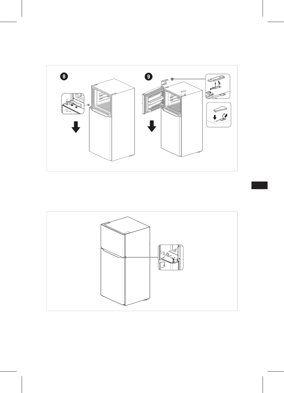 supérieure (du kit de charnières) sur le haut du réfrigérateur. Couvrez la charnière