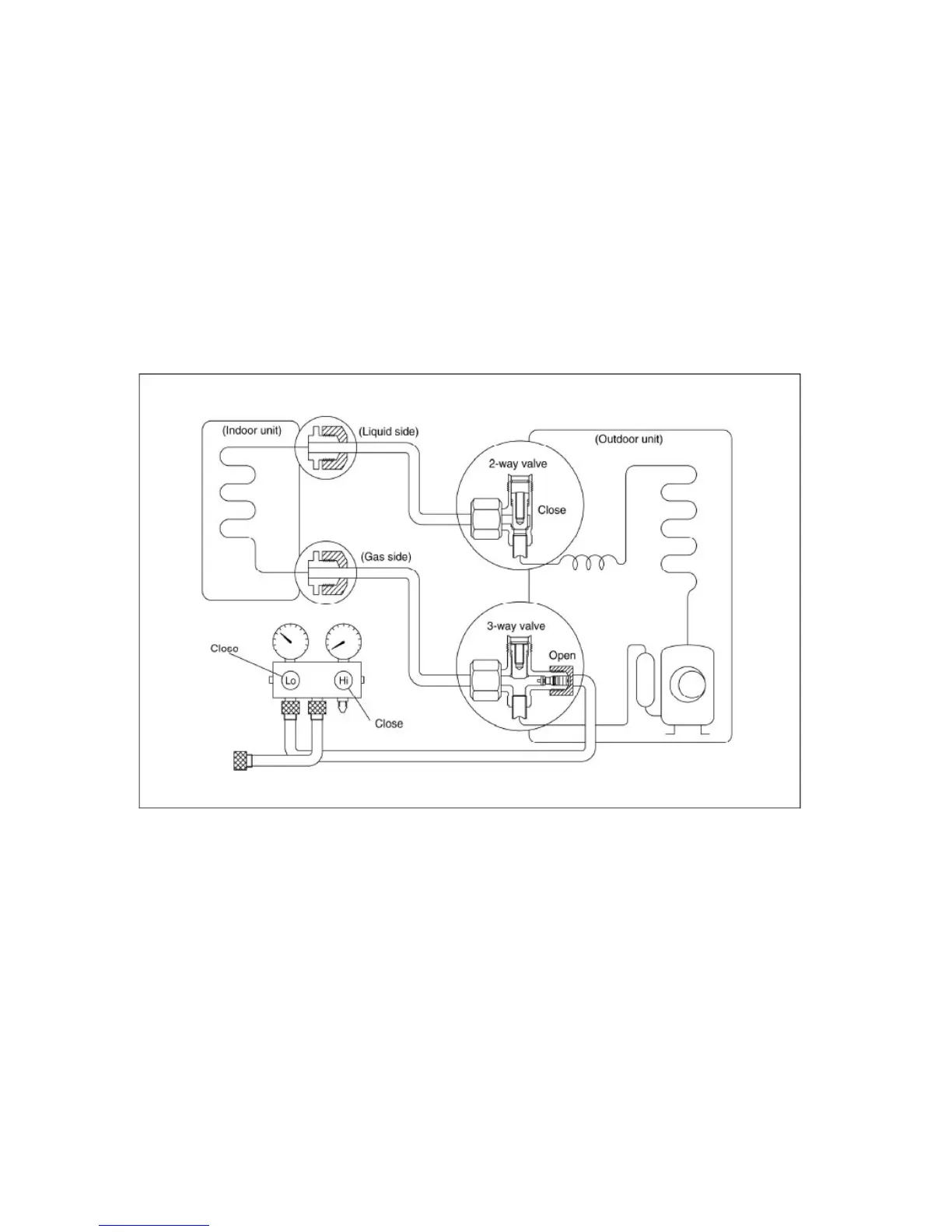 2). Connect the charge hose with the push pin of handle lo to the 3-way valves gas service port.