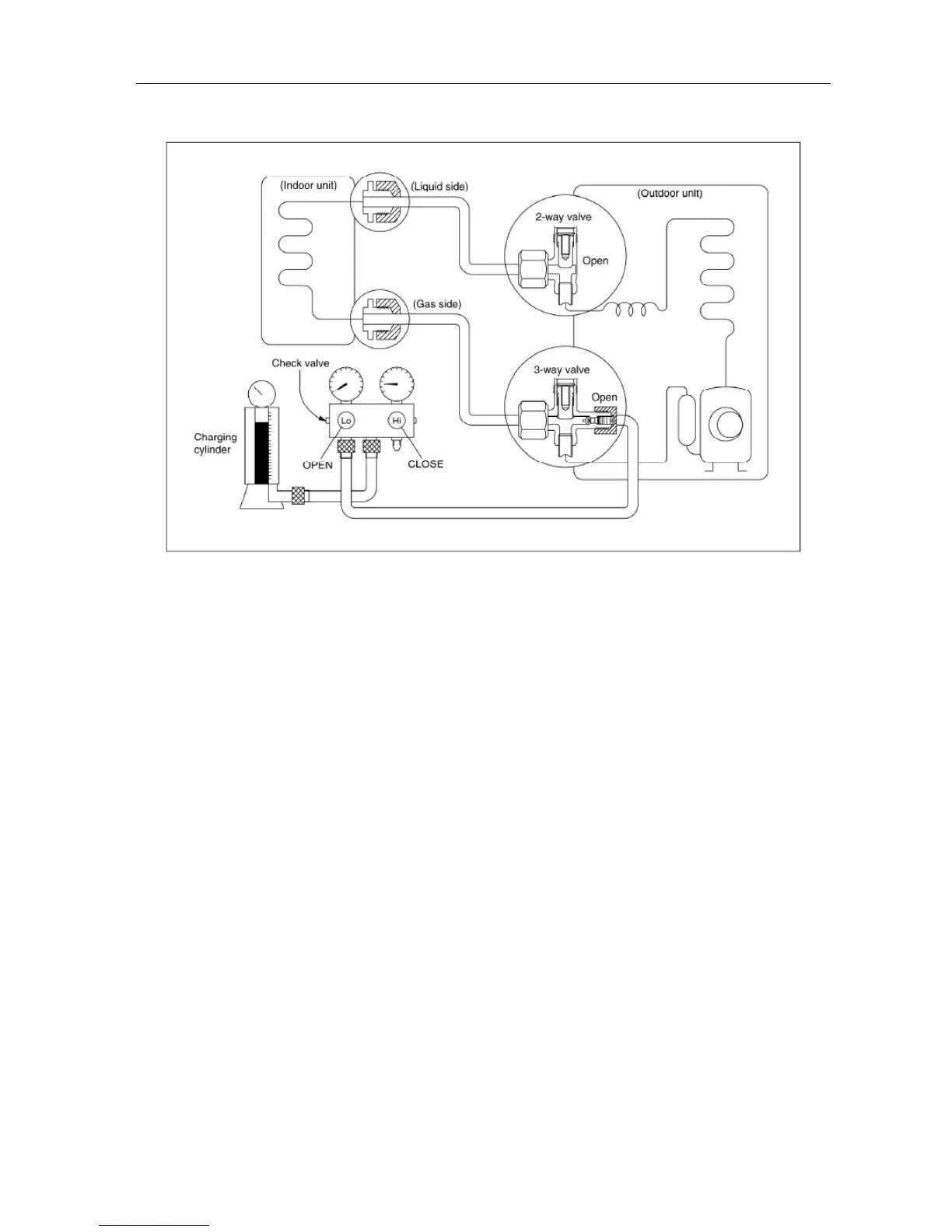 3. Open the valves (Low side) on the charge set and charge the system with liquid refrigerant.
