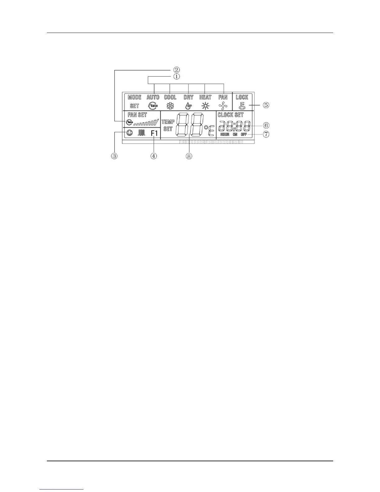 ① Mode Display: Press MODE button can select ‘AUTO’, COOL’, ‘DRY’, ‘HEAT’ and ‘FAN’