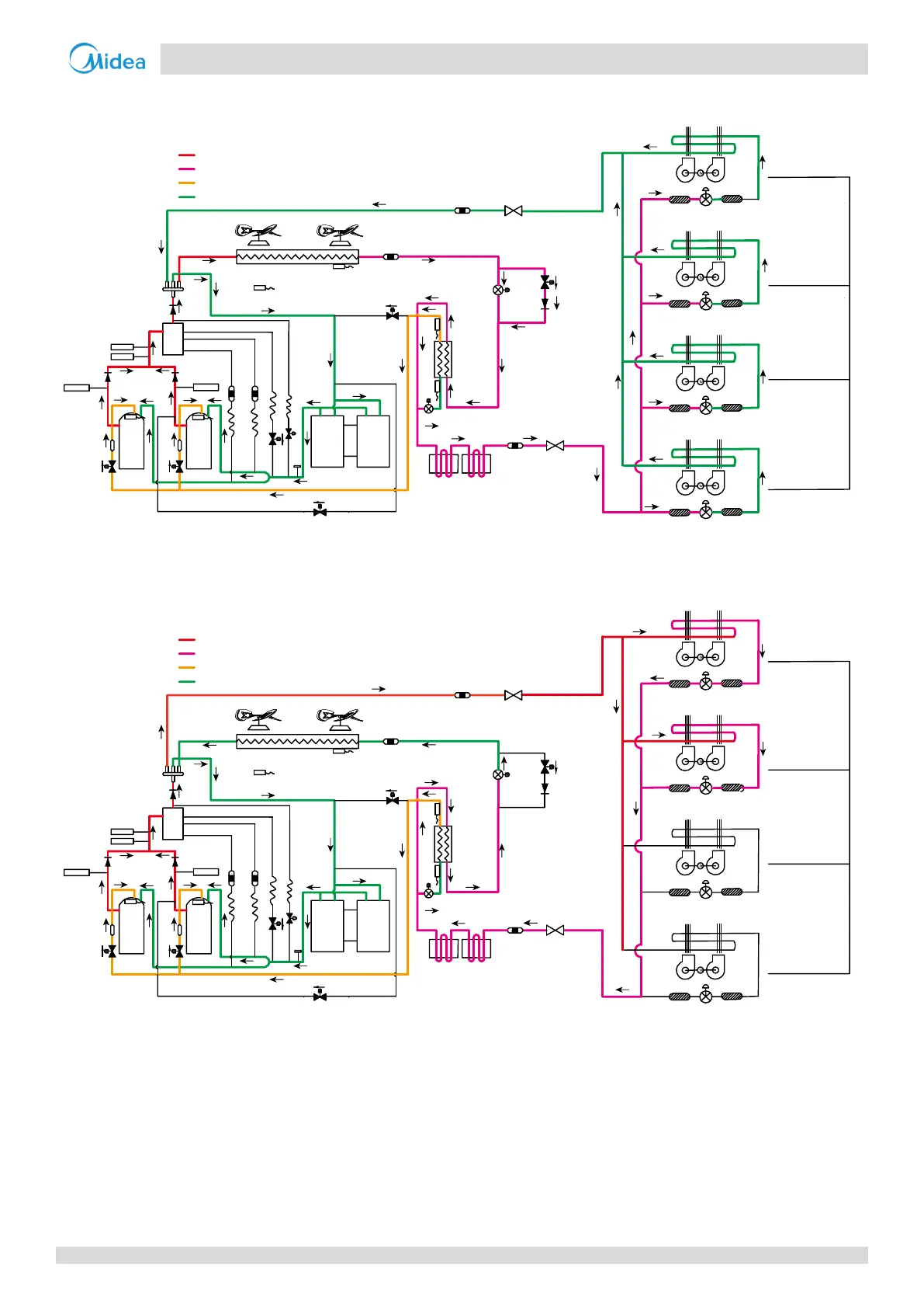 Figure 2-3.19: 30/32HP refrigerant flow during oil return operation in heating mode and during defrosting operation