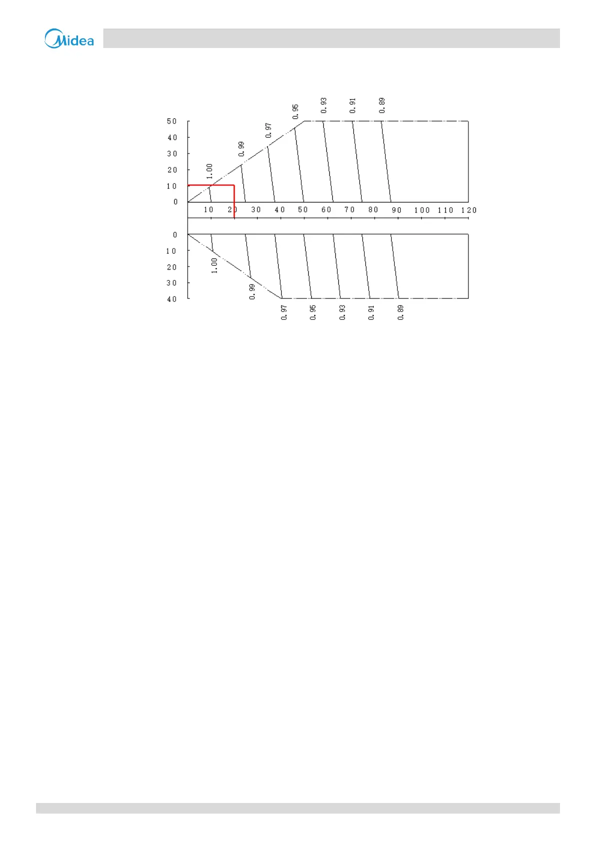 1. The horizontal axis shows equivalent length of piping between farthest indoor unit and first outdoor branch