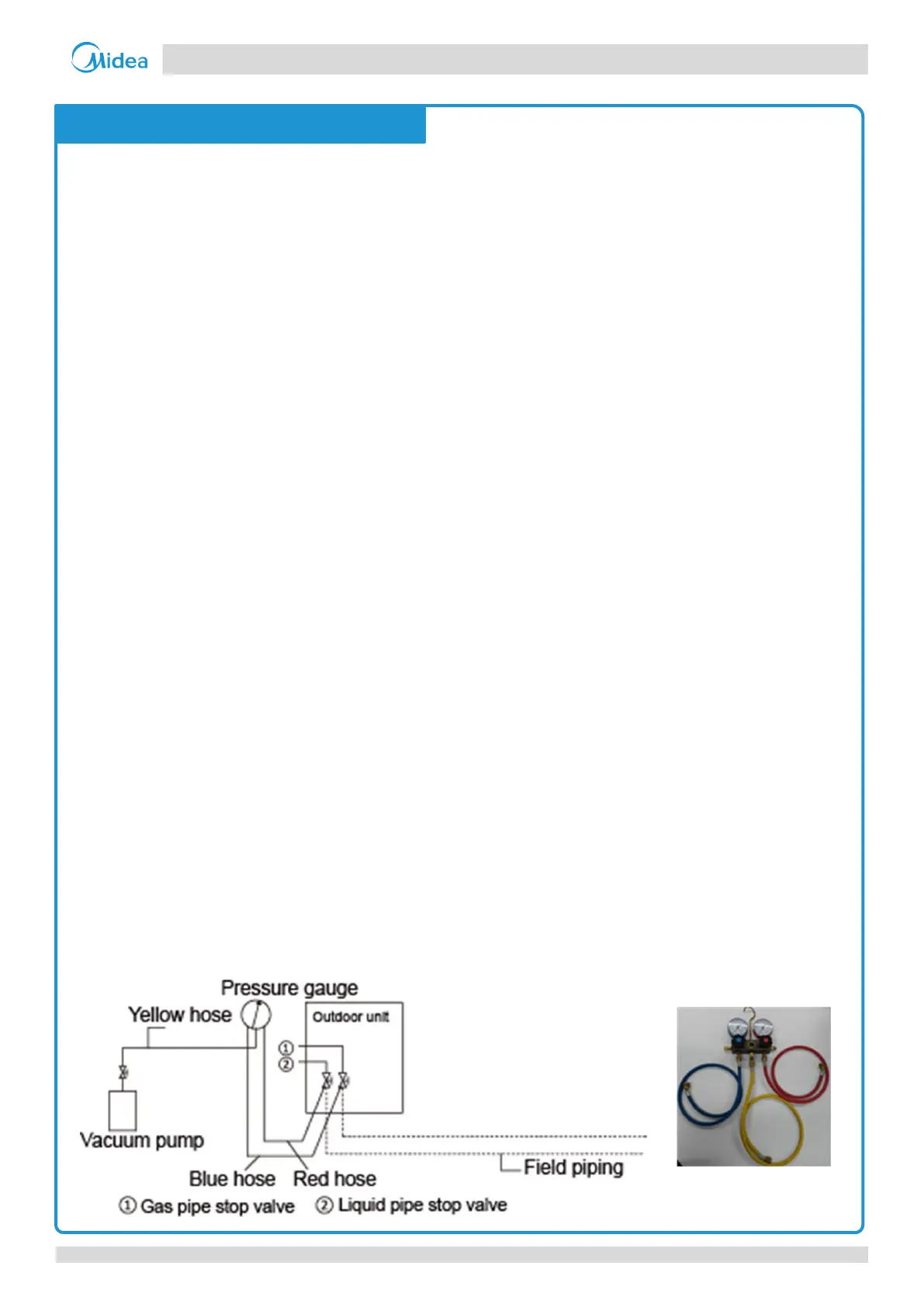pressure side) hose to the master unit liquid pipe stop valve and the yellow hose to the vacuum pump.