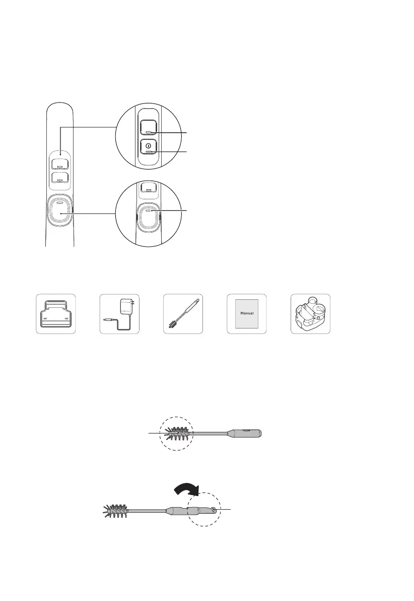 • A hair brush at one end, which is used to clean stubborn dirt attached to the waste water tank and