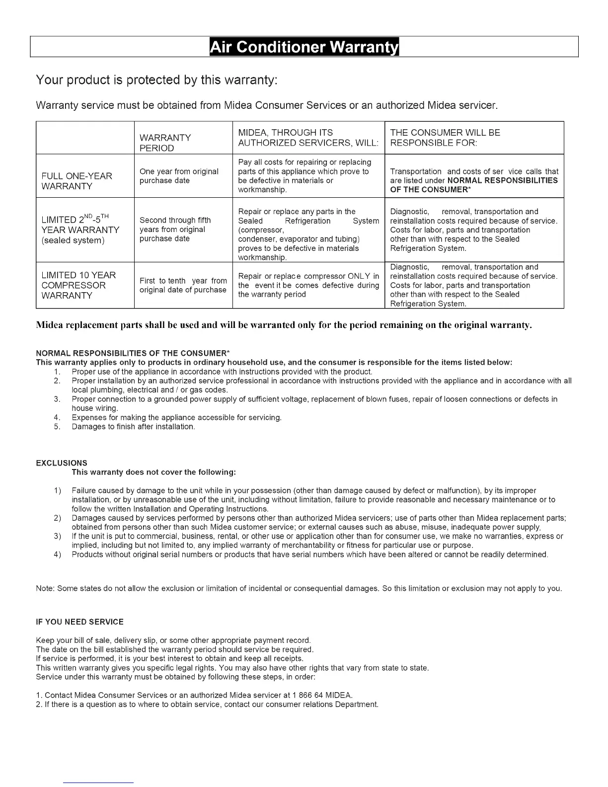 Warranty service must be obtained from Midea Consumer Services or an authorized Midea servicer.