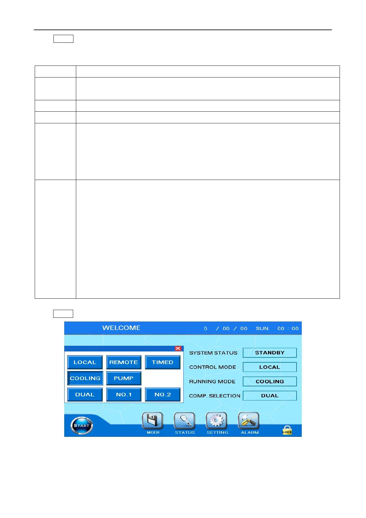 Set control mode(Local, remote, timer),operating mode(cooling, heating, pumping) and single or dual