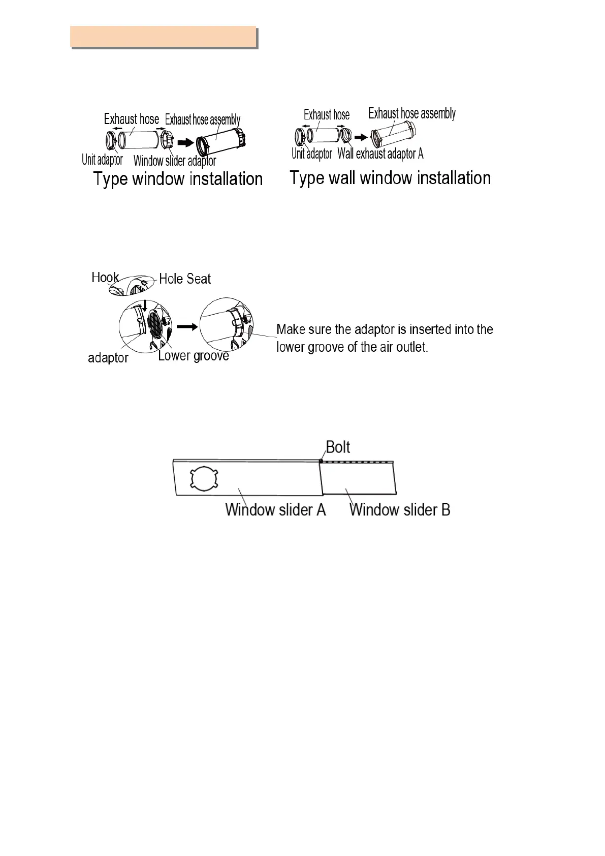 hook of the adaptor is aligned with the hole seat of the air outlet and slide down the Exhaust hose assembly