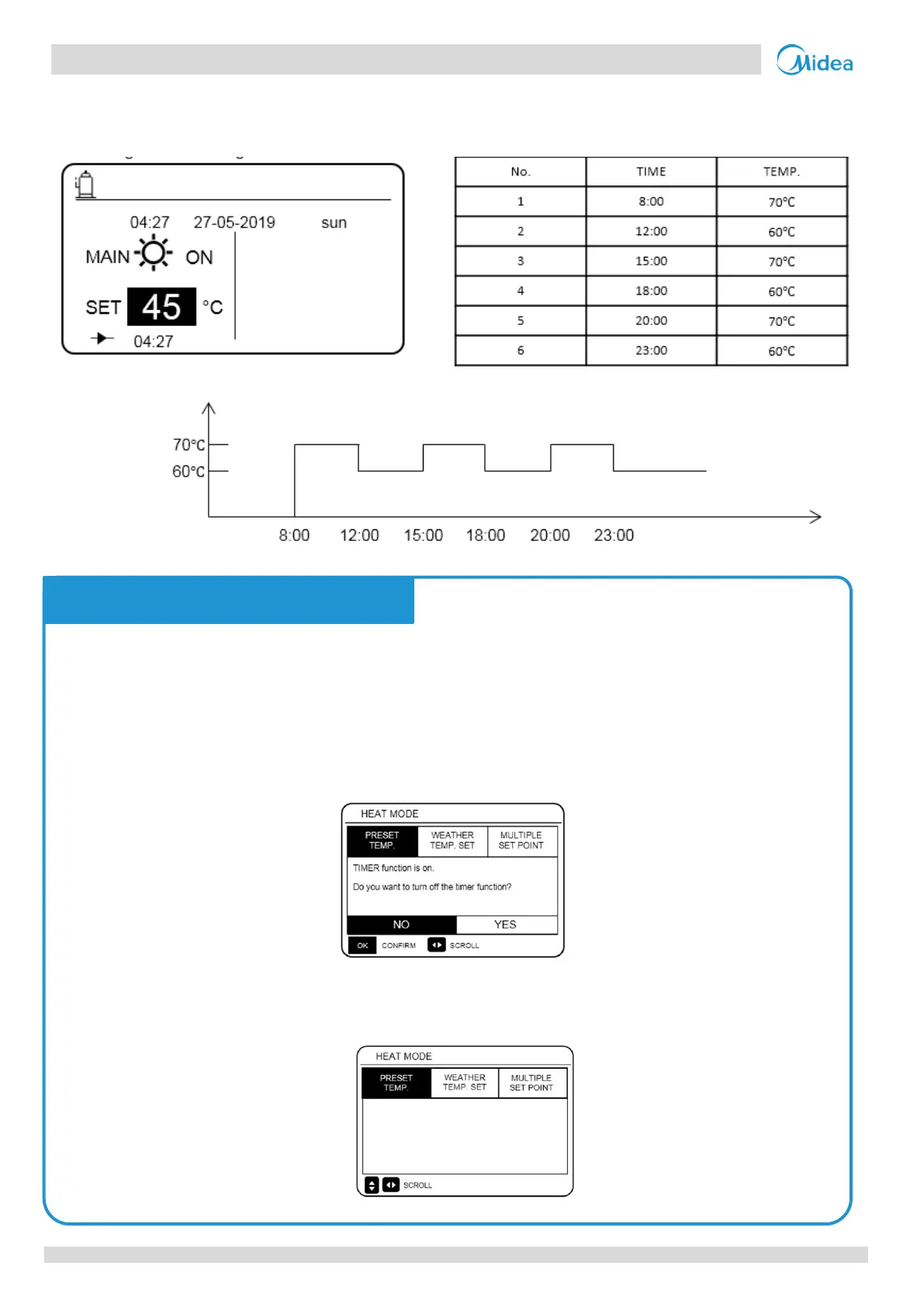 The time is 8:00 and temperature is 60℃. If PRESET TEMP. is set as follows, the hydraulic module will operate according to the