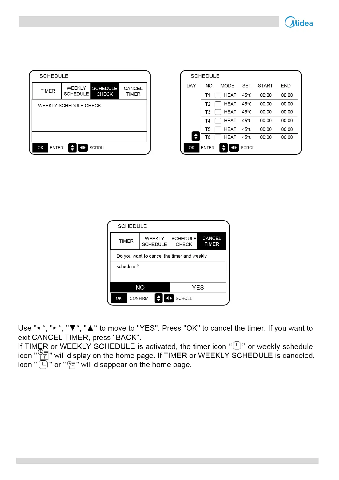 Go to ''MENU'' > ''SCHEDULE'' >''CANCEL TIMER''. Press ''OK''. The following page will appear: