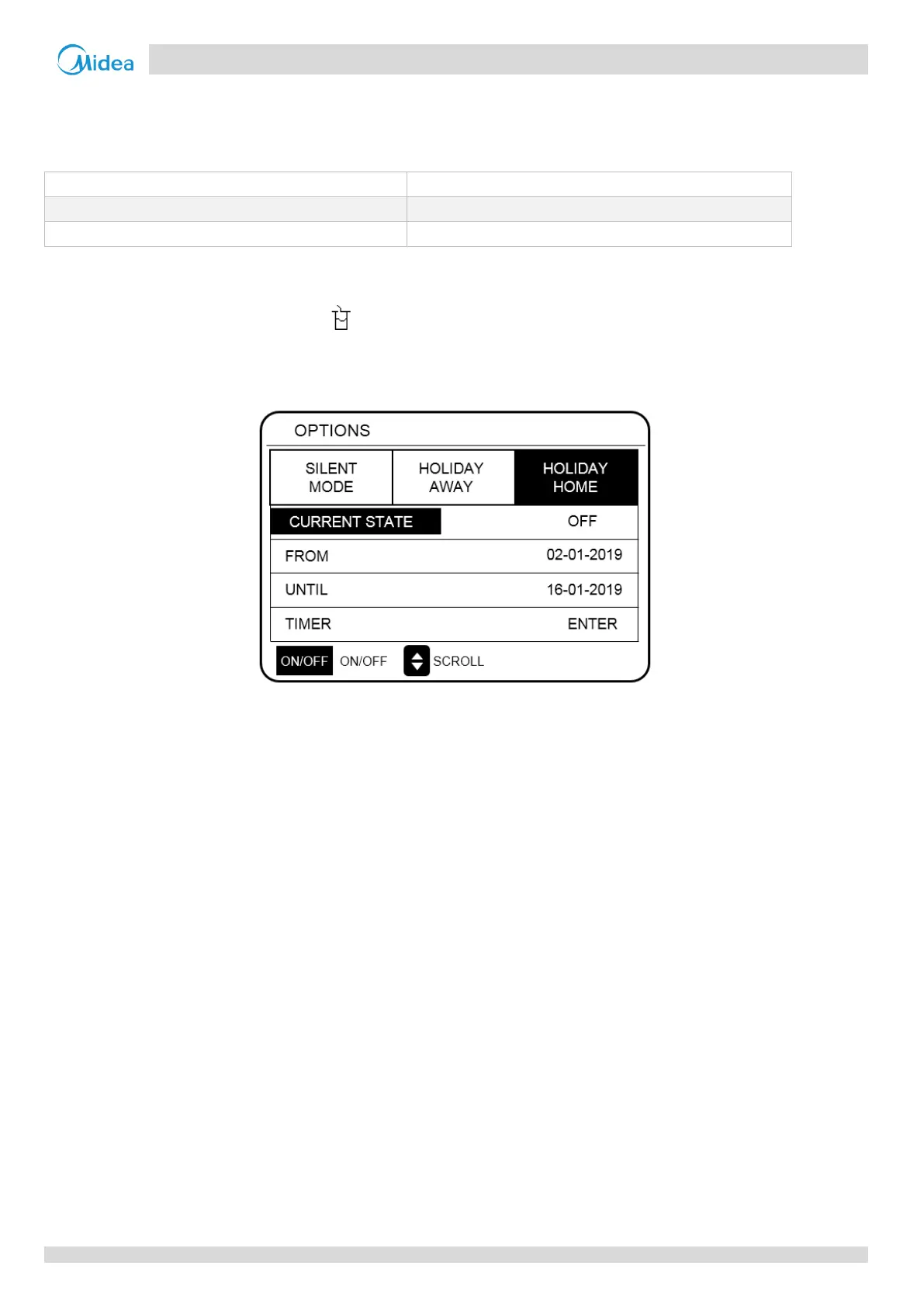 Go to ''MENU'' > ''OPTIONS'' > ''HOLIDAY HOME''. Press ''OK'' . The following page will appear: