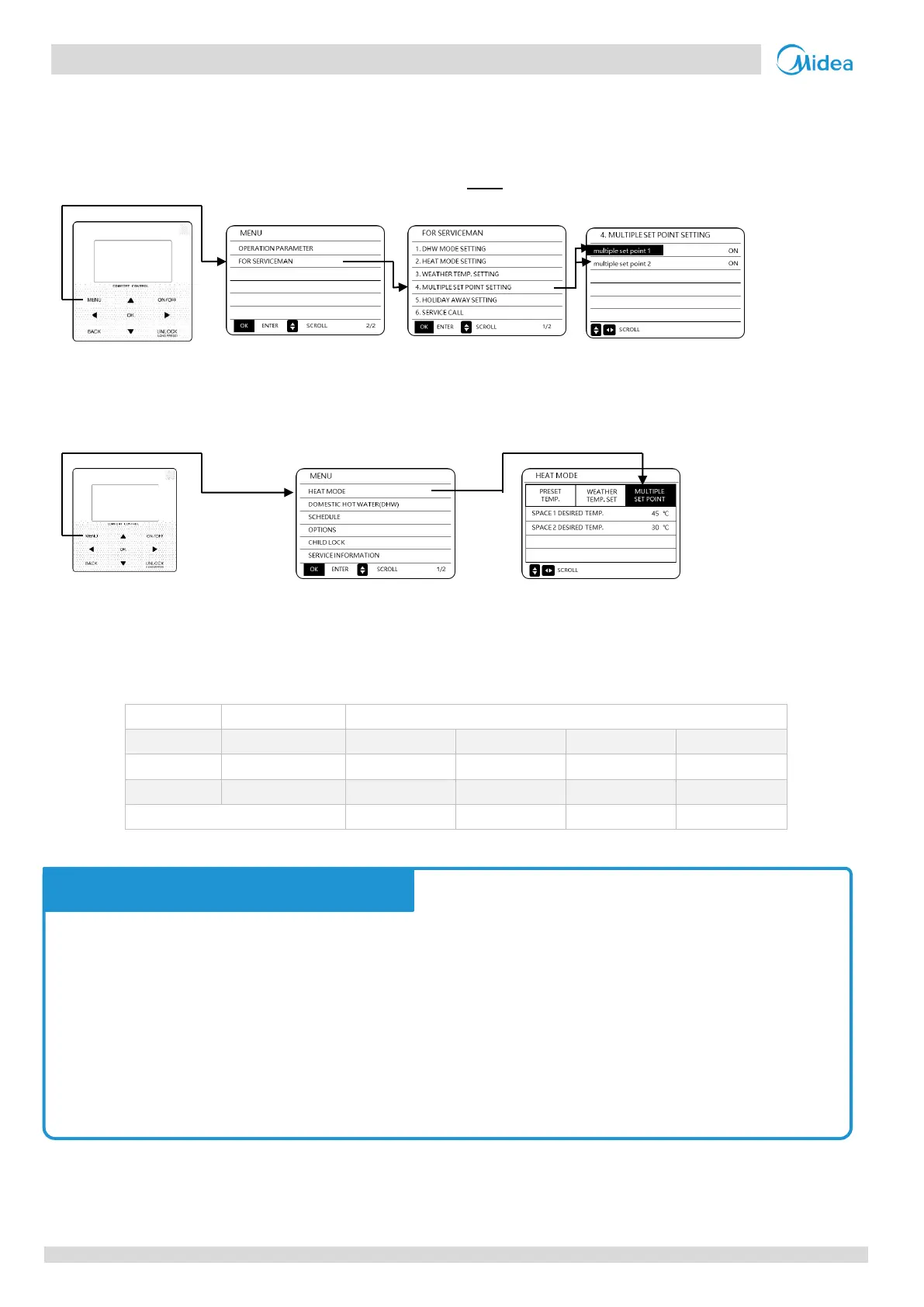 space0 can be set on the main interface of the wired controller, while space1 and space2 temperature are set