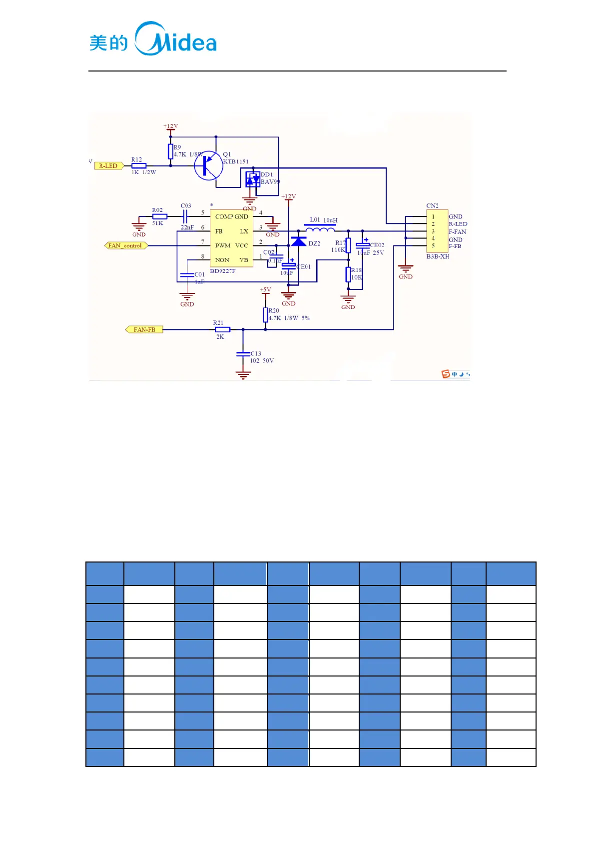 12 V voltage is reduced to 7~12V through the control chip BD9227F ,output it to F-FAN pin and