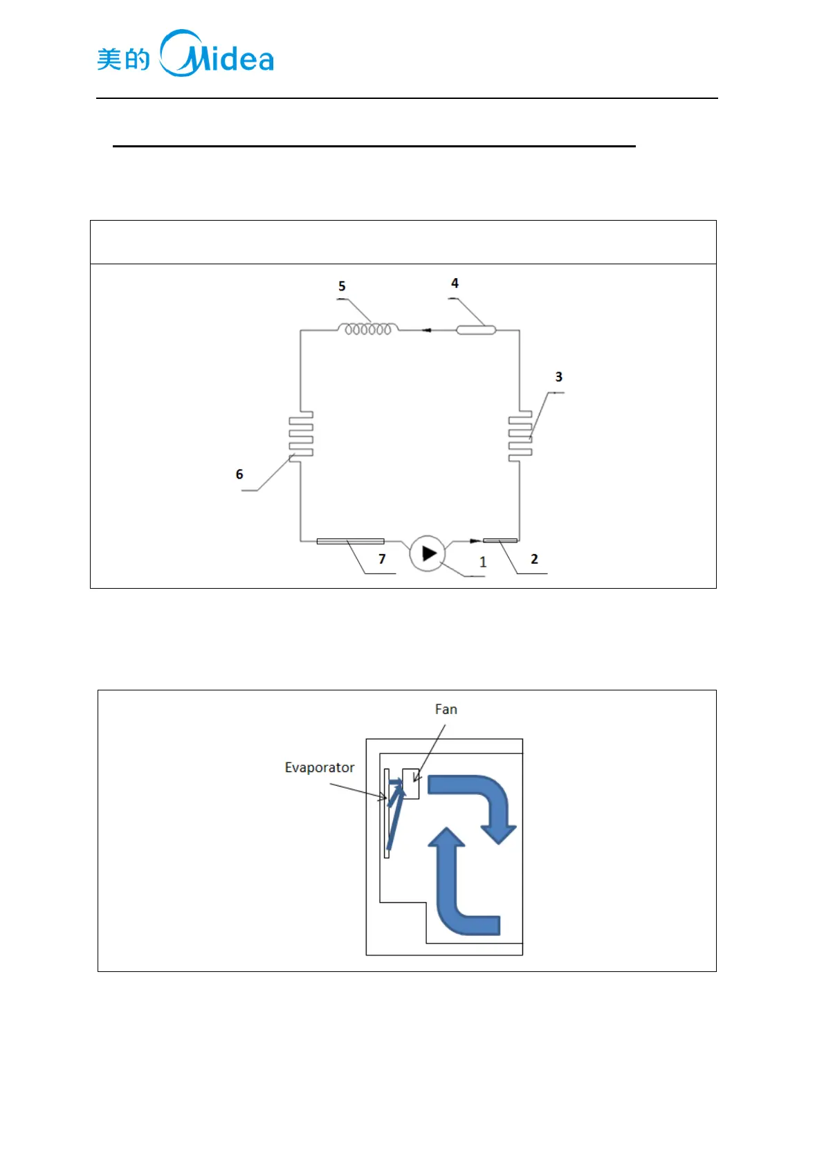 1Compressor→2Exhaust transition pipe→3condenser→ 4Dry filter →5Capillary tube→ 6Evaporator→7Return