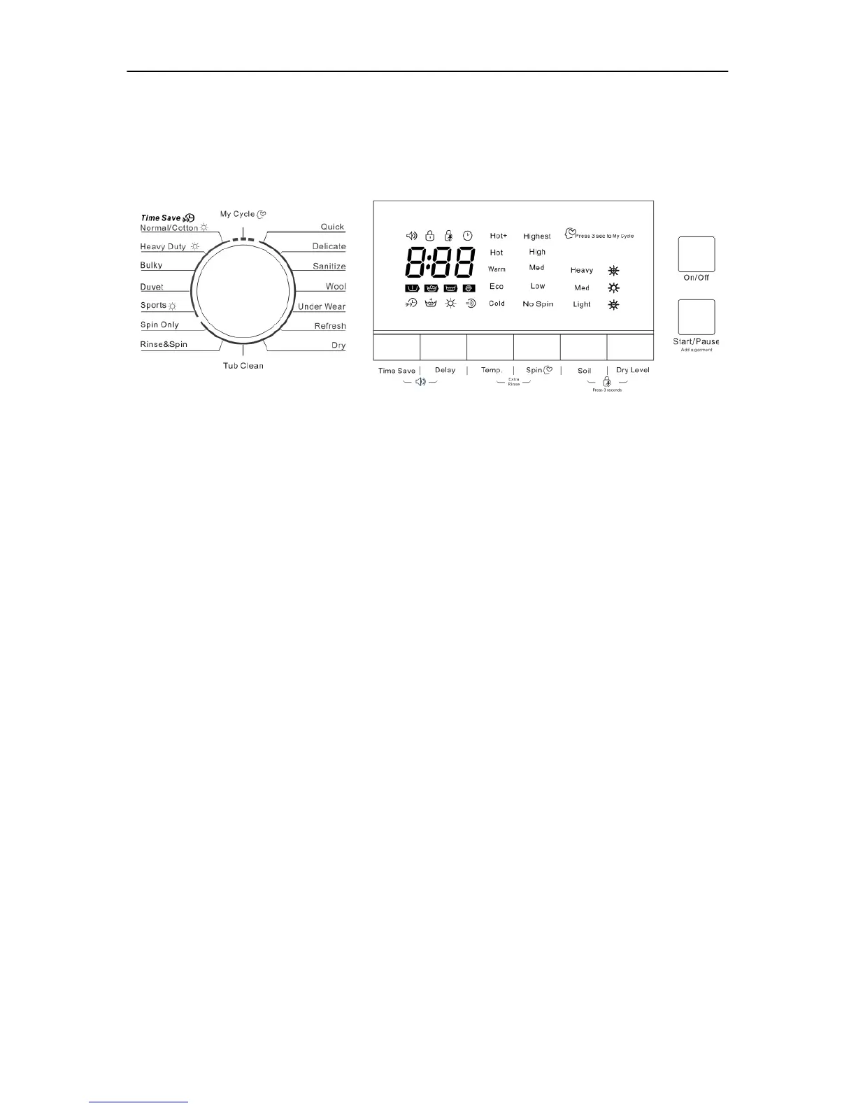 Soil level button: Press this button to set the soil level for wash cycle, Heavy, Medium and Light.