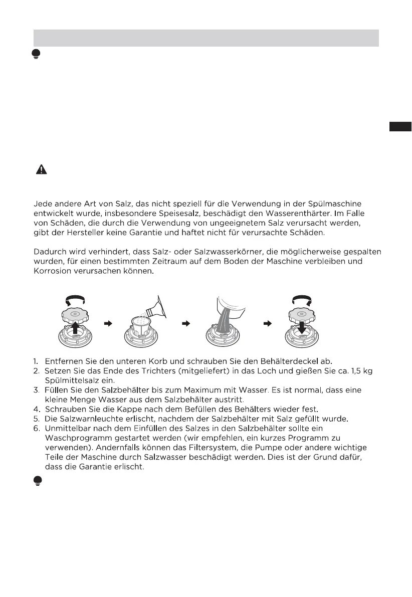 Der Salzbehälter darf nur nachgefüllt werden, wenn die Salzwarnleuchte im Bedienfeld