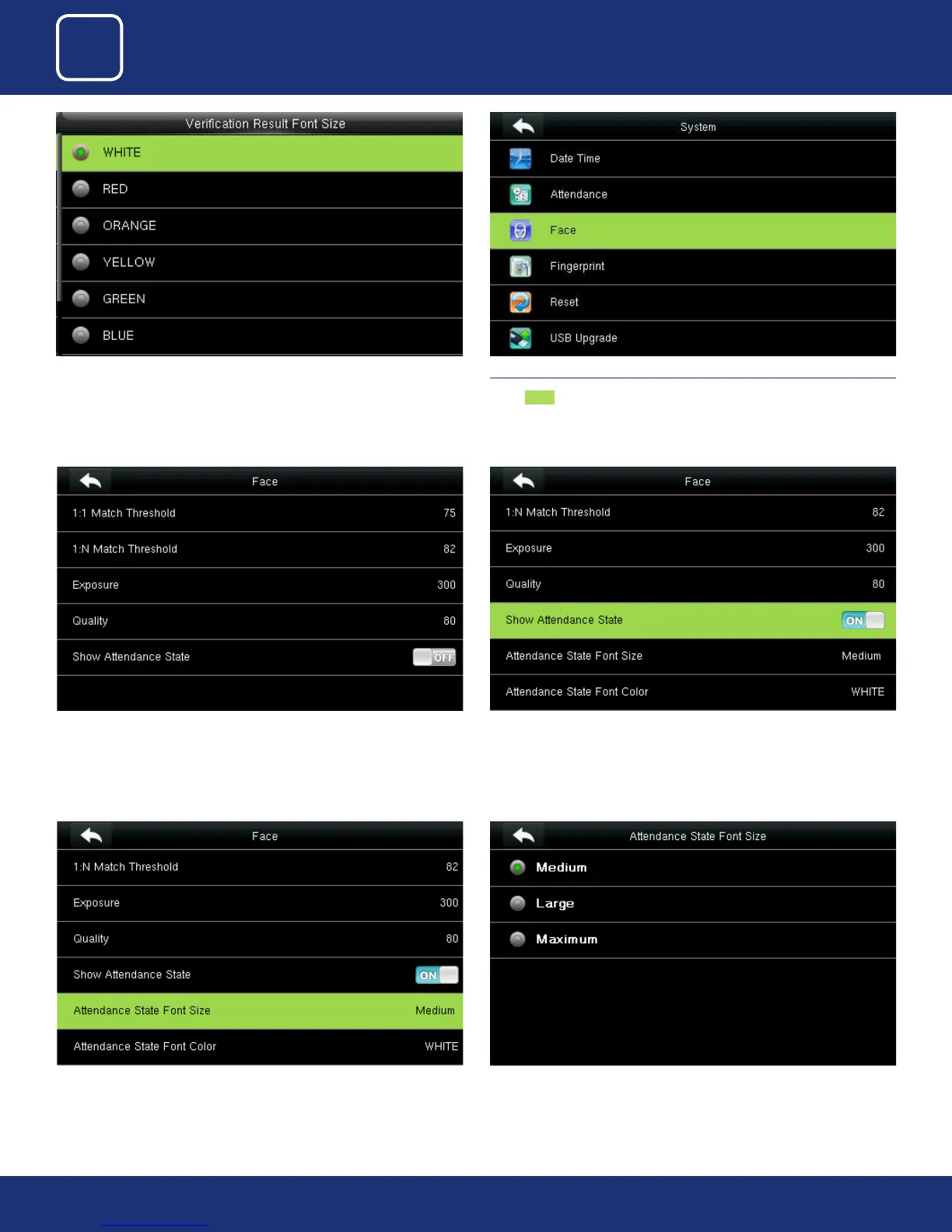 You can change the setting of face templates from the options above. Select “Show Attendance State” and turn “ON”. Once you turn “ON” you can