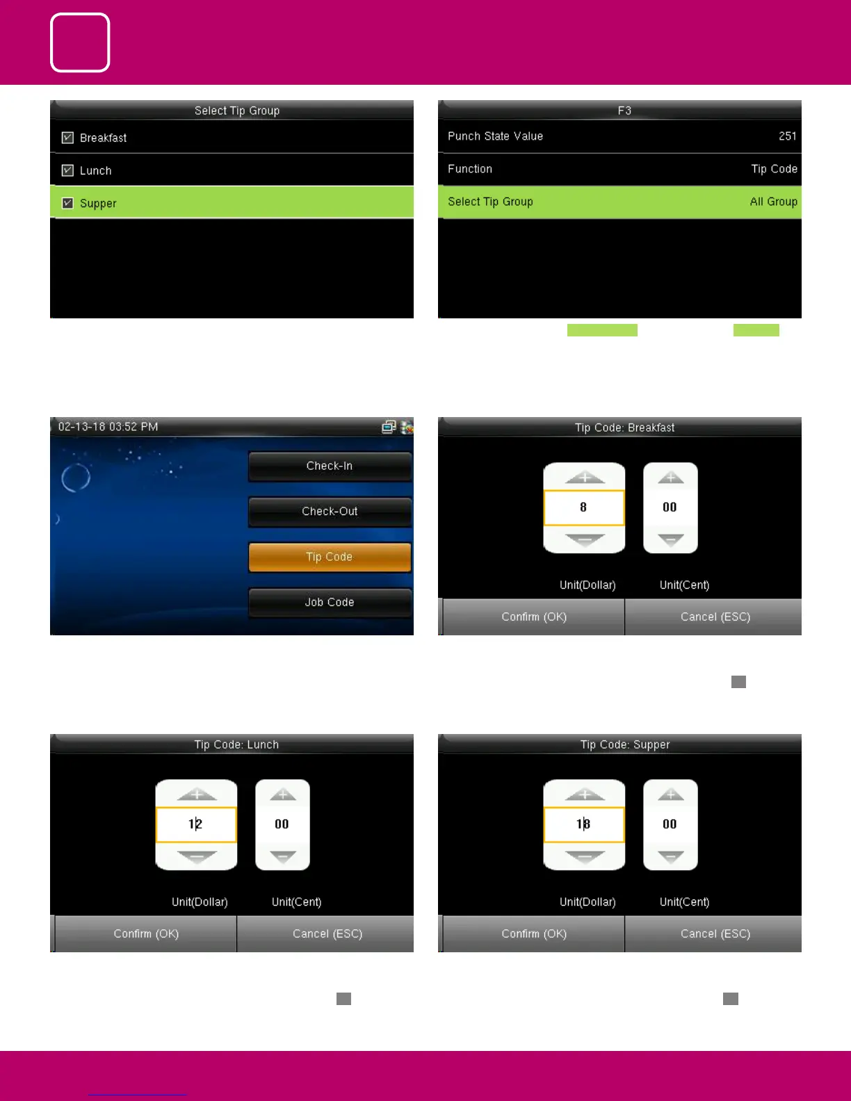 Select F3 key on the main screen as tip code. You can edit the tip in the amount of dollars by pressing up and down arrow