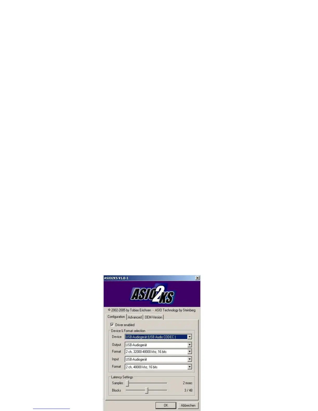 5. Go to Control Panel, double-click ASIO2KS and make your settings.