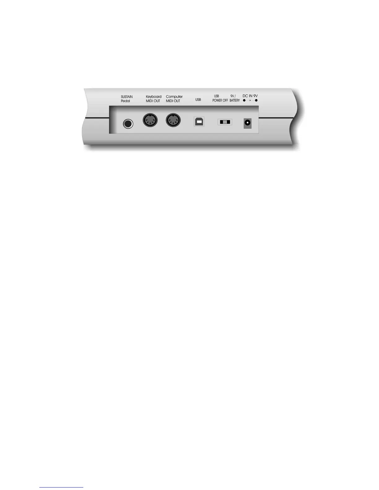 The 3-way power switch turns the keyboard's power to external 9V power or power off. The