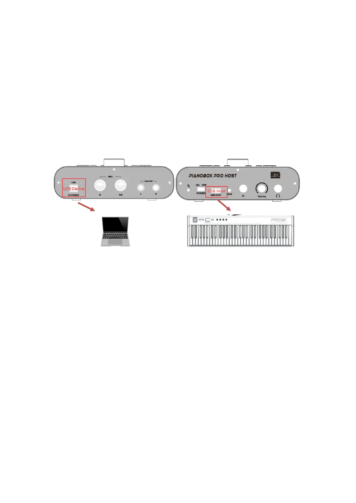 Die PianoBox Pro Host unterstützt die gleichzeitige Verwendung von USB-Gerät und USB-Host.