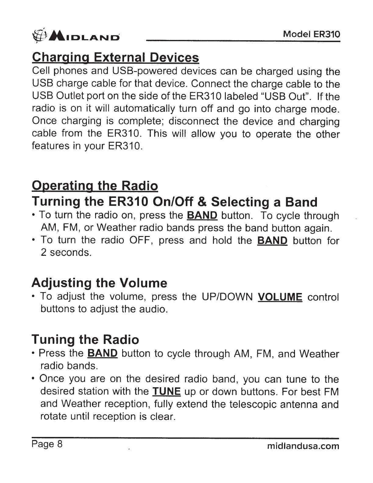 Turning the ER310 On/Off & Selecting a Band