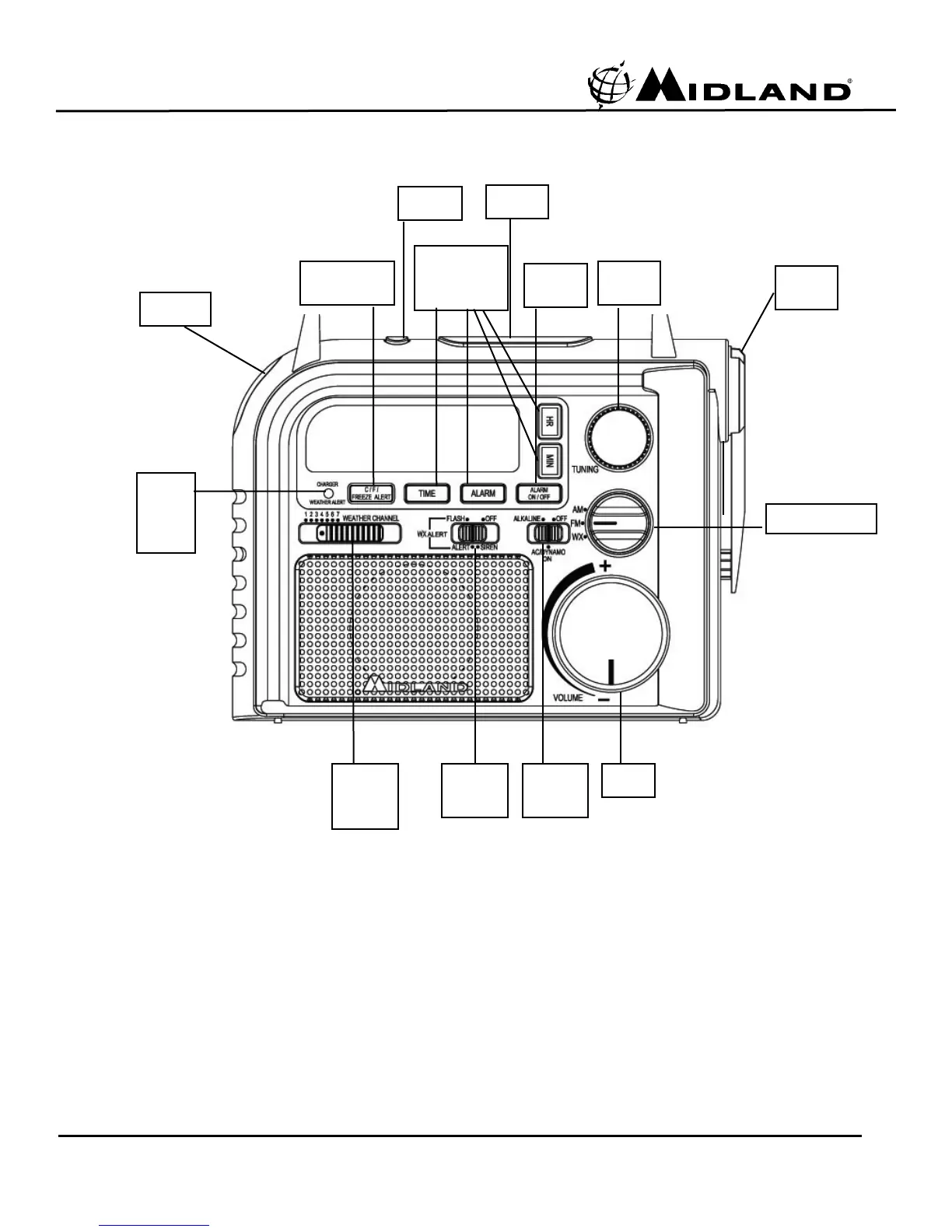Midland ER102 - ER102 Controls and Functions; Radio Tuning and Volume Controls; Power and Charging Controls; Weather Alert and Utility Controls
