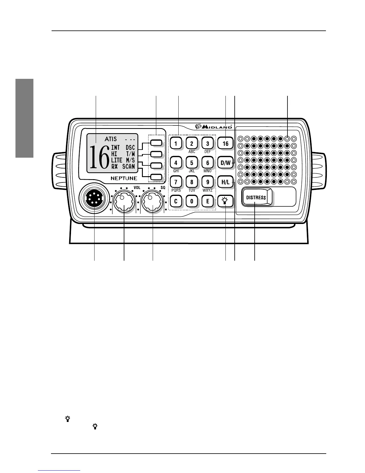Turns NEPTUNE on/off and regulates audio volume reception. The radio is turned off when