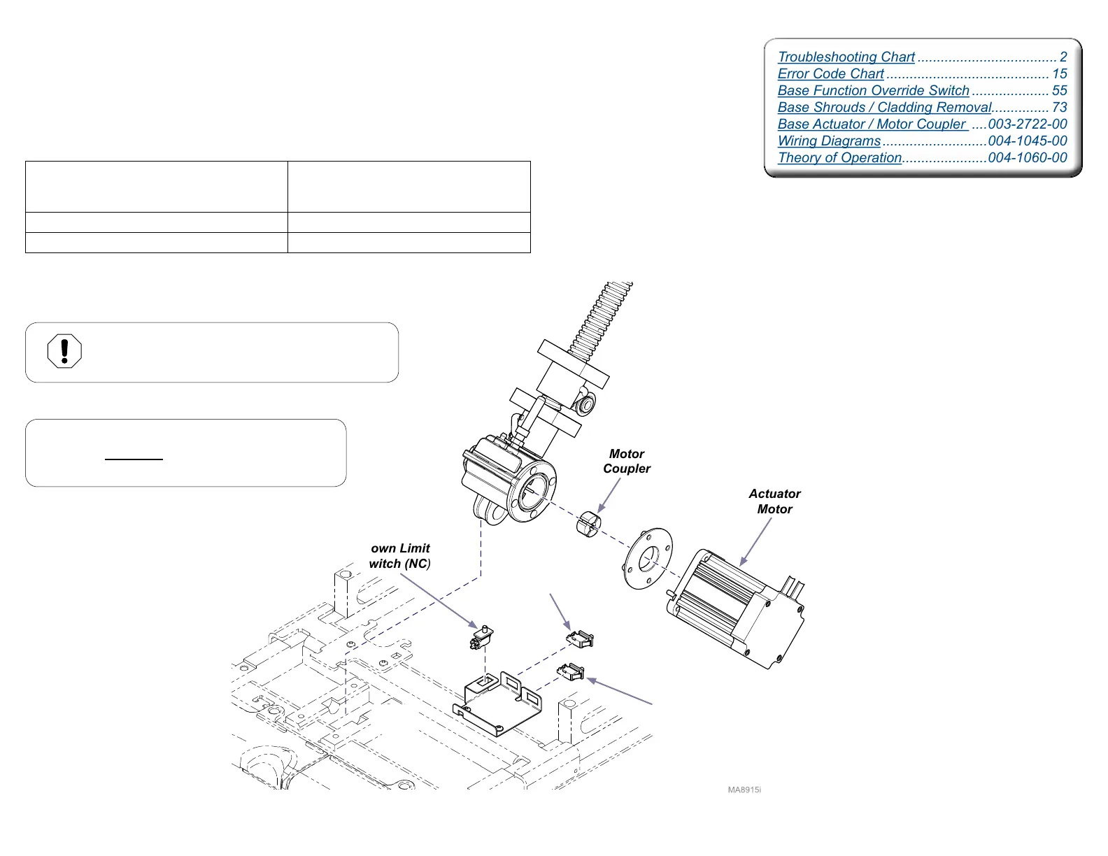 This illustration shows the base limit switches and the serviceable components of the base actuator.