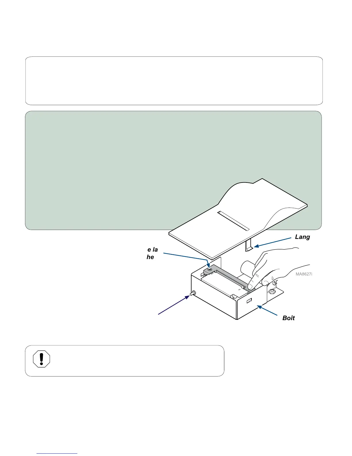 D) Posez la nouvelle cartouche Assurez-vous que le ruban est inséré devant le papier et à