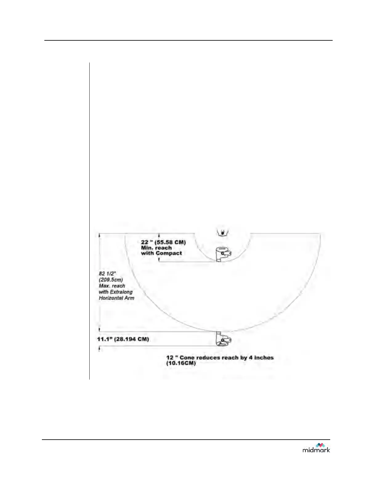 The reach of the system is measured from the tip of the Cone with the arm fully
