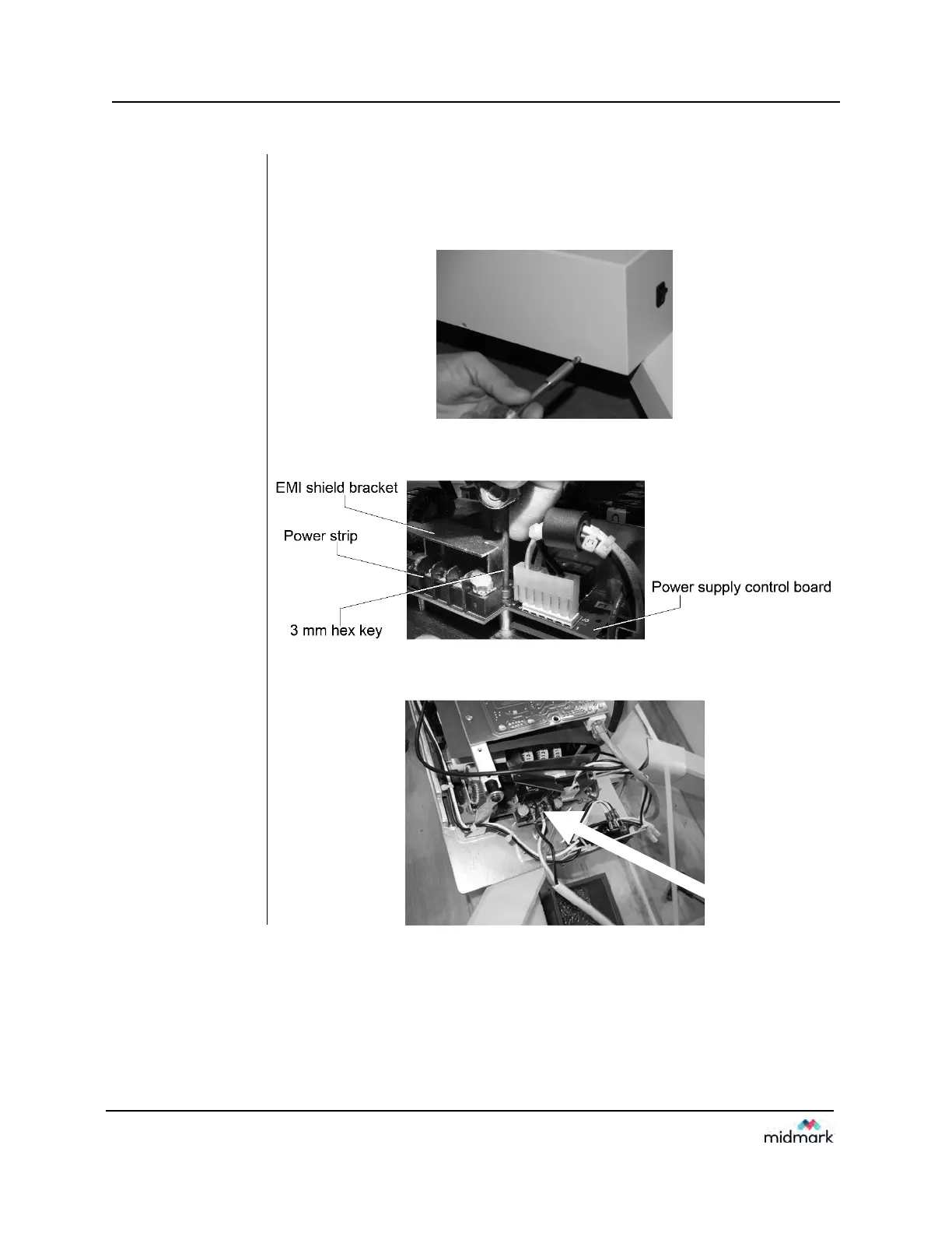 3. Loosen the three screws that secure the power cord (Part# E1-13028).