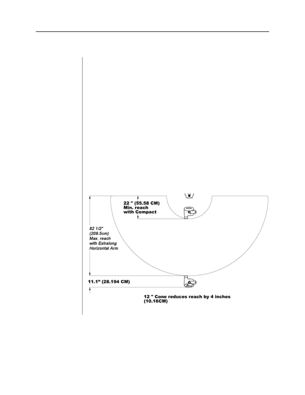 The reach of the system is measured from the tip of the Cone with the arm fully