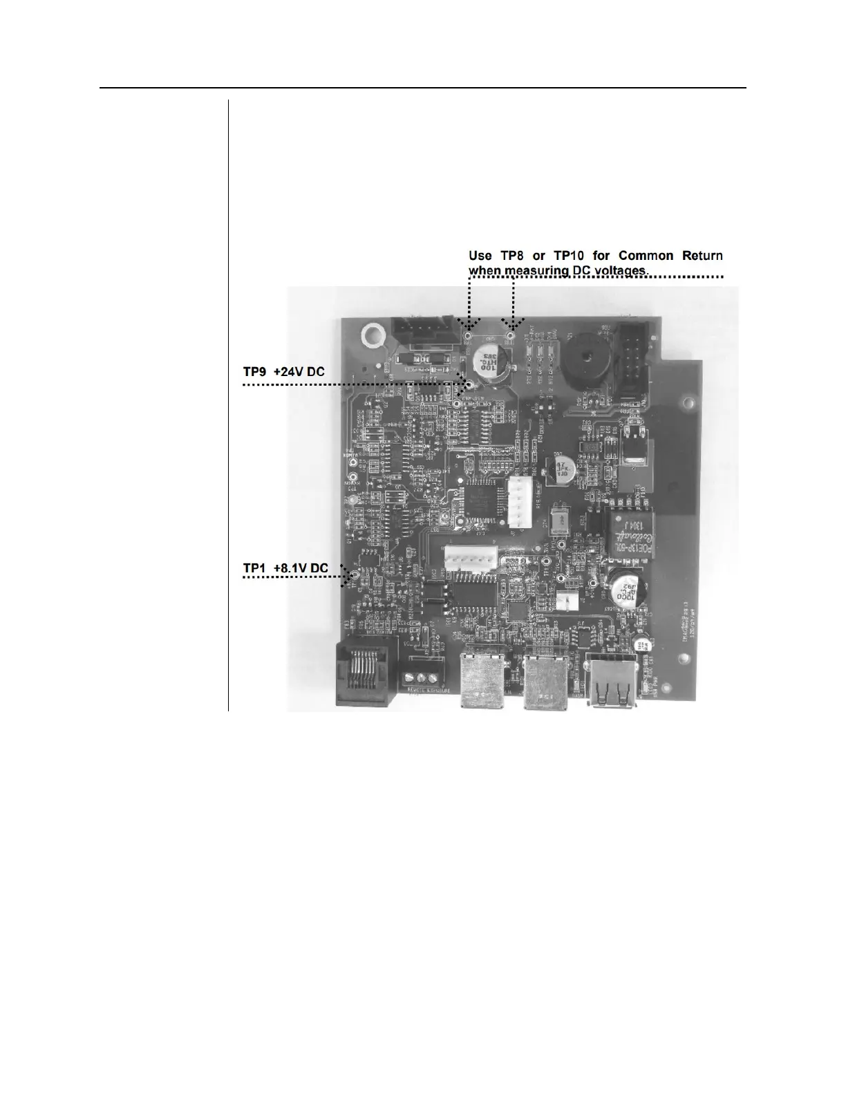 1. On the Logic Board, measure voltages at TP1 (+8.1V) and TP9 (+24V). Use