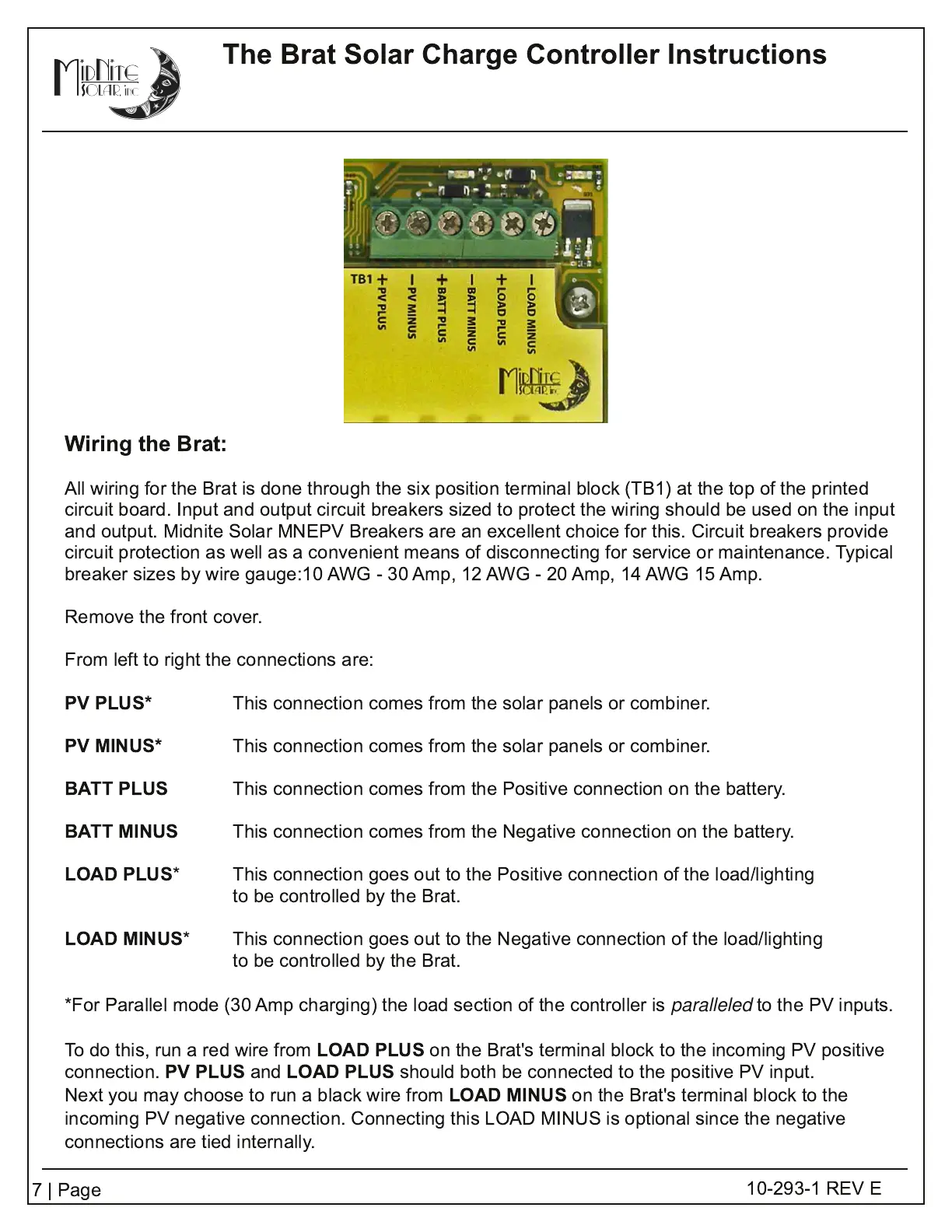 on the Brat's terminal block to the incoming PV positive